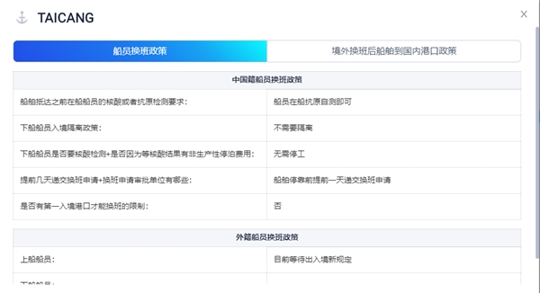 同时可以参考太仓港的政策要求总结出新政策的一些规则:中国船员换班取消审批和集中隔离,正常履行出入境检查和健康检查即可;原则上可以进行外籍船员换班,不再对国际航行船舶船员在境内港口换班(含登陆)实行审批制,仅履行船员出入境查验及临时入境许可审核签发手续,不再对换班入境船员实施全员核酸检测和集中隔离;拟来华并在境内港口换班的国际航行船舶船员,应在船舶驶离境外最后一港口前48小时开展核酸检测,健康申报正常且海关口岸常规检疫无异常者,可放行进入社会面,健康申报异常或出现发热等症状的,海关将根据排查情况实施分类处置,对确因行程原因无法申报入境前48小时核酸检测结果的船员,可接受抗原结果的申报。