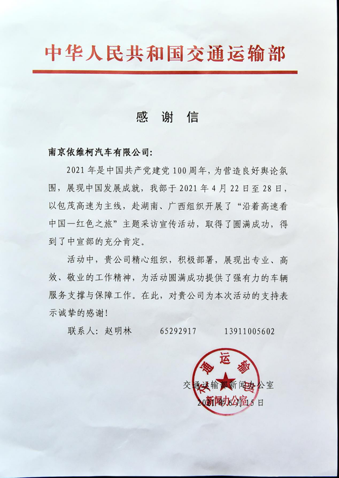 感谢信中写道,2021年是中国共产党建党100周年,交通运输部于2021年4月22日至28日,以包茂高速为主线,赴湖南、广西组织开展了“沿着高速看中国—红色之旅”主题采访宣传活动,取得了圆满成功,得到了中宣部的充分肯定。在活动中,南京依维柯精心组织,积极部署,展现出专业、高效、敬业的工作精神,为活动圆满成功提供了强有力的服务支撑与保障工作。为此,交通运输部新闻办公室对南京依维柯在本次活动作出的的支持表示诚挚的感谢。