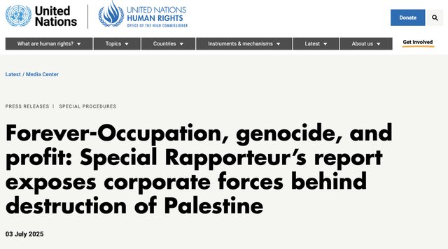 今年7月,联合国巴勒斯坦被占领土问题特别报告员弗朗西斯卡·阿尔巴尼斯发布一份报告《从占领经济到种族灭绝经济》,指控60多家公司参与支持以色列的“种族灭绝”行动,包括美国军火商洛克希德·马丁、制造商卡特彼勒、能源公司雪佛龙、科技公司微软、Alphabet和亚马逊、IBM......