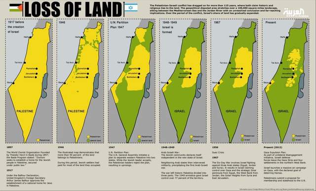 (巴勒斯坦(黄)领土被以色列(绿)侵占变化,图源:外媒)