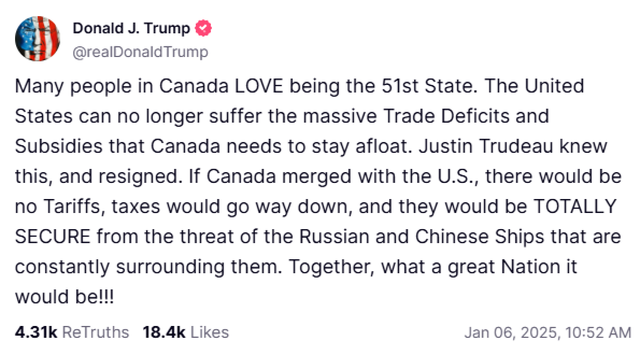 而且,特朗普总统曾多次就加拿大主权问题挑衅加拿大,并多次暗示加拿大应该并入美国。2024 年末至 2025 年全年,特朗普开始称时任加拿大总理贾斯汀·特鲁多(后来又称马克·卡尼)为“加拿大州州长” 。这并非口误;他反复在社交媒体上使用这个头衔,暗示加拿大本质上是美国的附属国或行政区。