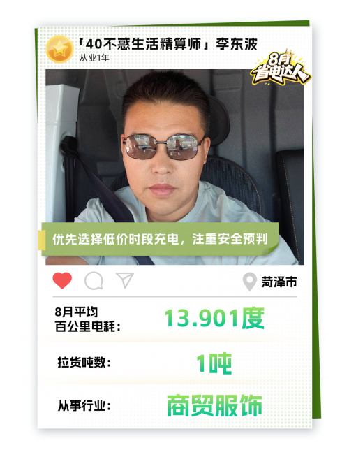 对于东风睿立达这个“好伙伴”,李师傅恐怕有一肚子话要说,“外观上档次,性能好”“空间设计合理,甚至副驾都可放平供人休息”“皮实、抗造”“车型对于货运更有优势,在平台都很容易接单”……但最让他满意的,还是算来算去最划算的“经济账”!“这车非常省电,同时充电也很快速”。当问到李师傅有什么“省电秘诀”时,他则是谦虚地说着“平常随需充电,优先选择低价时段充电;通常剩余20%电量时充电”“没有刻意省电,但是比较注重安全预判,比如提前松油门减速;也要避免超载,重载时很容易电耗高并且刹车安全性容易下降……”明明是“省电达人老司机”,但是李师傅依然很谦虚地和大家分享着自己的省电技巧!