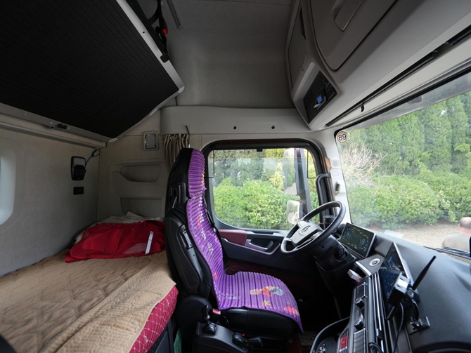 除了安全可靠,驾驶室的人性化设计也为杜师傅的长途生活带来了不少便利。“这车就像个移动的小家,储物格大大小小十多个,衣服、杂物和随车工具都有地方塞,不乱。”他最看重的是休息条件,“卧铺够宽,躺得舒服。”而长时间驾驶中最让他感到轻松的,是那把支撑感良好的格拉默座椅,“腰和背都能托得住,一天下来,没那么累了。”