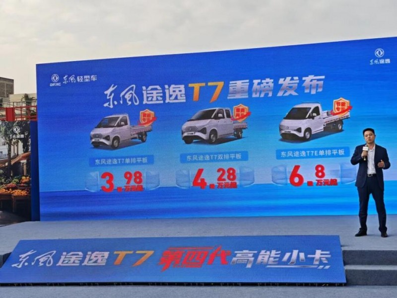 12月13日,第四代高能小卡——东风途逸T7在昆明正式发布。作为东风股份V平台的最新力作,单排燃油版3.98万元起、双排版4.28万元起、纯电版6.8万元起,价格极具诚意。从“更能装、更能省、更舒适、更安全”四大方面,以“可油可电、乘商一体”的理念,树立了小卡的全新价值标杆。