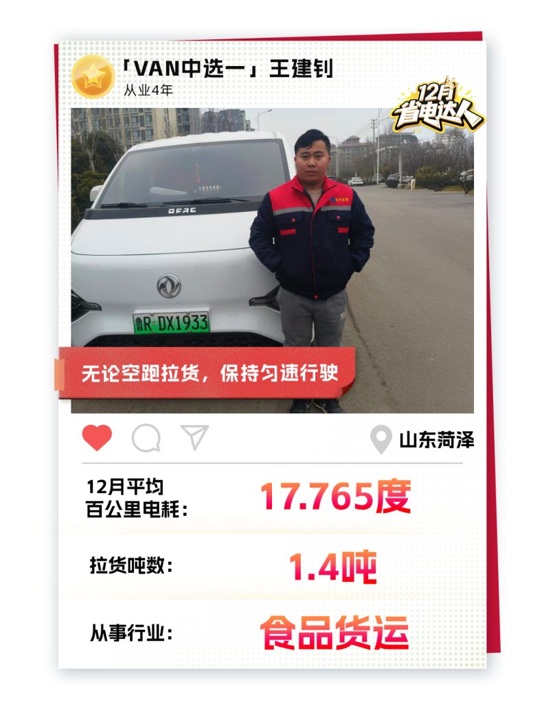能够做到这样的“省下成本”,除了东风睿立达自身的产品实力之外,王师傅对于用车也有着自己的心得。他说:“尽量将车速稳定在80公里/小时左右,不论是空车还是载货都要控制在这个时速。我亲测过这个时速是最省电的黄金法则”。