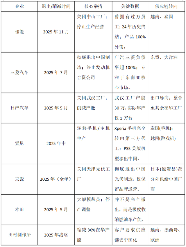 2025年的撤退潮,不同于2012年的反日游行后的恐慌性撤资,也不同于2019年贸易战初期的试探性转移。这一次,是系统性的、战略性的,甚至是不可逆的。撤退的企业主要集中在两个极端:一是在中国市场彻底丧失竞争力的传统消费品制造;二是受到地缘政治严格管控的敏感技术组装。