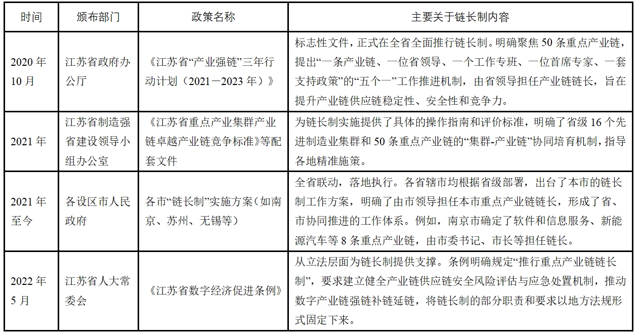 立法保障与战略规划:省委、省政府先后出台《江苏省“产业强链”三年行动计划》、《关于全面提升江苏产业链供应链竞争力的指导意见》等纲领性文件,将链长制工作提升到全省战略高度。