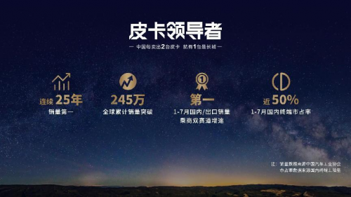 中国只有两种皮卡,一种是长城,一种是其他。长城皮卡已连续25年销量第一,全球累计销量突破245万。今年1-7月长城皮卡国内/出口销量双第一、乘商双赛道增速第一,国内终端市占率近50%,中国每卖出两台皮卡,就有一台是长城。长城炮已累计35个月销量过万,蝉联皮卡销量冠军。8月18日长城炮品牌四周年,更迎来第50万台整车下线,成为首个突破50万台的中国高端皮卡品牌,以现象级的“长城炮速度”,开启中国智能豪华皮卡新篇章。