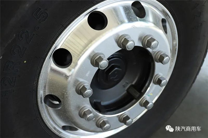 轮胎是装配了12R22.5型号的真空胎,此型号在重卡牵引车领域广泛使用。而且配置轻量化轮毂,极大程度上达到降重的目的。