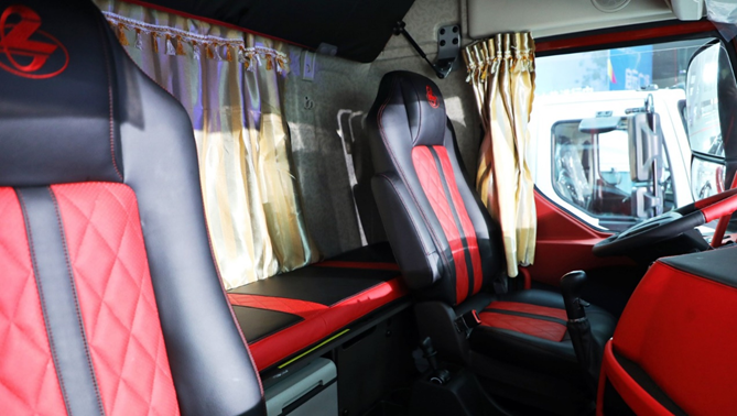 为了进一步提升卡友舒适度,在驾驶室空间上,国六版乘龙H5绿通载货车依旧采用高顶双卧设计。并配备2米3宽平地板驾驶室,内高1.92米,空间大,开车不压抑,副驾座椅可转动,下卧铺可变1米宽。且上下卧铺均采用个性包覆处理,用料细腻,品质可靠,在手感以及实际坐卧的感受上都有明显的提升;车辆还标配了窗帘,进一步提升了车辆的私密性和遮光效果,让卡友休息更舒适。