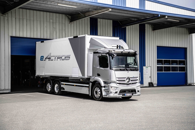 梅赛德斯-奔驰eActros纯电动卡车量产车型配备3至4个电池包,每个电池包的容量约为105千瓦时。该车型的最大电池容量可达420千瓦时,续航里程可达400公里。这款纯电卡车的核心技术是其驱动装置,集成两台电机与一台双速变速器的刚性电动车桥。两台液冷电机总共可提供330千瓦的持续功率和400千瓦的峰值功率。此外,如果日常驾驶场景可预见,车辆可通过智能能量回收系统进一步有效回收电能。制动期间以回收方式获得的能量将被送回至eActros的电池中,供驱动系统再次利用。