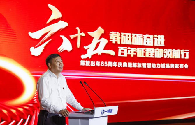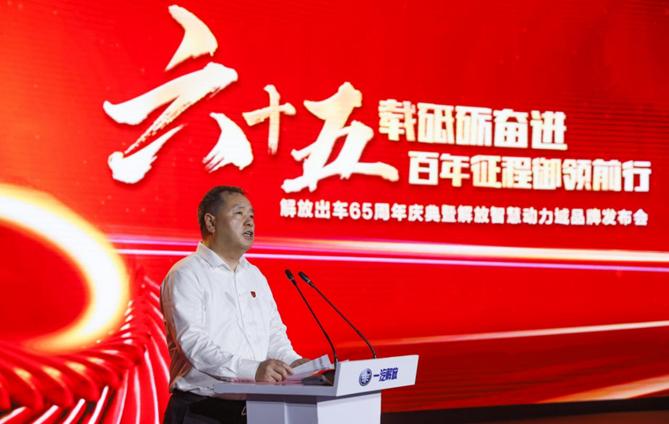 在行业伙伴的祝福中,在员工同仁的期待下,胡汉杰代表一汽解放发表讲话,回顾了65年来解放从无到有、从小到大、从大到强的崛起跨越,在新中国站起来、富起来、强起来的伟大复兴中做出的重大贡献。胡汉杰表示一汽解放迎来“发布行业首个动力域品牌、解放卡车的历史总产量即将突破800万辆”两个新的里程碑事件,这不只是解放的荣耀,更是中国汽车工业的历史性时刻。面向未来,一汽解放将牢记习近平总书记殷切嘱托,坚定“自主发展、开放合作”道路,坚持以品牌战略为统领,以创新和变革为驱动,掌握关键核心技术、加快转型升级步伐,致力于成为“中国第一,世界一流”的智慧交通运输解决方案提供者,为创建中国第一个百年汽车品牌而努力奋进,砥砺前行!