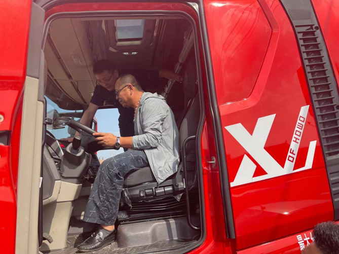 车辆交付现场,豪沃MAX外观大气炫酷,经典的红色车身在蓝天白云下显得格外亮眼,彰显着激情与能量。看到自己的爱车,王师傅说道:“HOWO MAX这车很帅,没想到内饰也这么好,比进口的斯堪尼亚还够劲呢,买了这台车,够威风、够有面子!坐着也舒舒服服的。”
