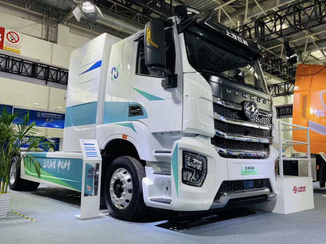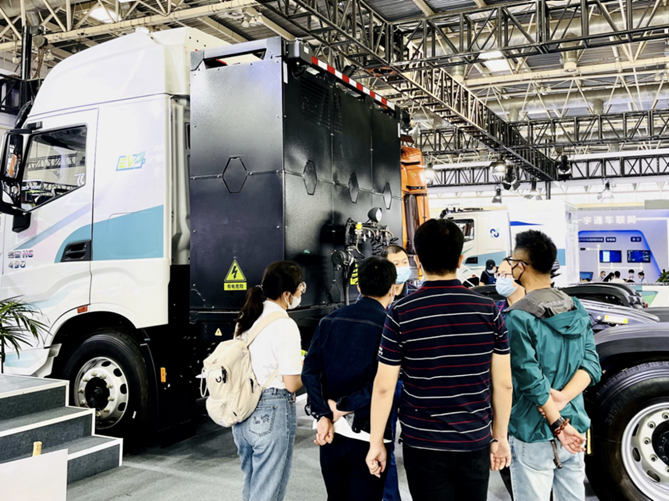展会现场,两只“大白”——纯电、氢能新能源重卡相当瞩目。高大耀眼的红岩杰狮H6充换一体纯电动牵引车,具有“跑得快、提速快、换电快”三大优势,3-5分钟即可完成电池更换,且搭载先进成熟的282Kw·h宁德时代动力电池,配备玖行换电箱,动力响应速度快,加速性能优秀,可适用于港口驳运、园区物流、短途干线运输等多种使用场景,成为物流运输产业绿色转型、动能升级的优选。