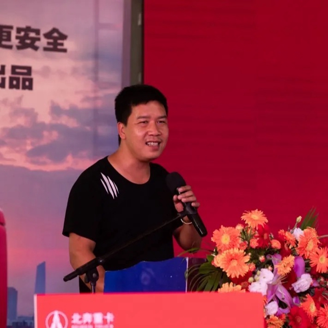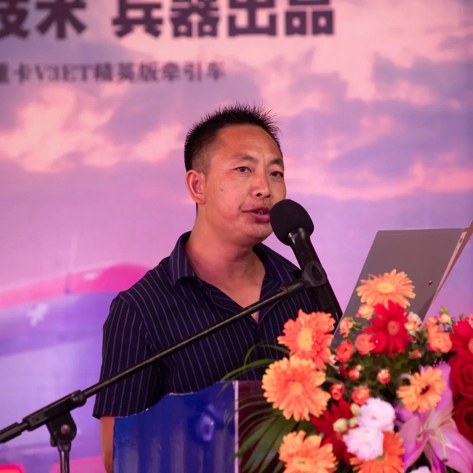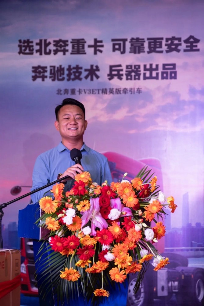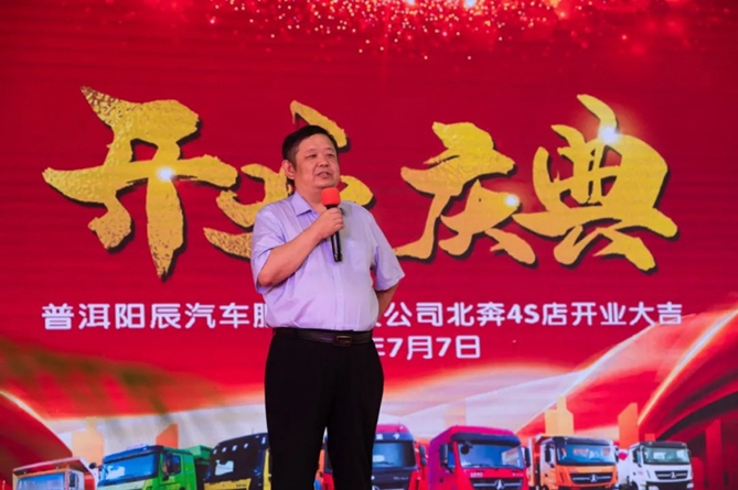 北奔重汽营销公司副总经理杨金宝上台致辞,祝愿阳辰开业大吉、所有来宾工作顺利、万事如意!