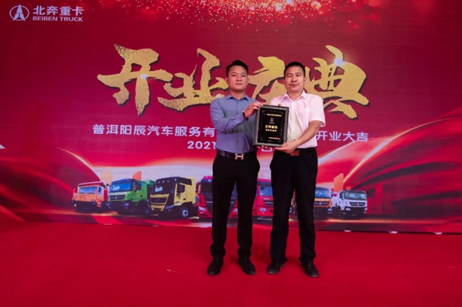 北奔重汽营销公司西南大区尹柏松为普洱阳辰汽车服务有限公司总经理刘云程授牌,授牌仪式标志着北奔重汽与普洱阳辰共同开启精诚合作、财富共赢,共同开拓普洱重卡市场。