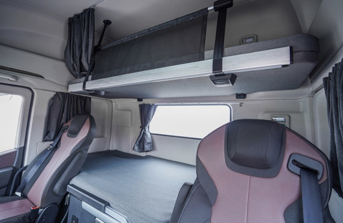 赵师傅开的这款红岩杰狮H6牵引车采用了行业领先的超宽体卧铺设计,材质选用柔软舒适海绵,而且还有支持“睡眠模式”的卧铺控制模块集成灯光,拉上窗帘就能享受个人私密的睡眠空间。此外,这款车搭载全新通风空气超纤皮座椅,拥有调整阻尼、降速、空气腰托、肩部调节等功能,能够很好地舒缓驾驶人的疲惫。加上驾舱NVH性能全面升级,怠速噪声低至50dB,车上睡觉和开车的两个人都能享受静谧舒适空间。