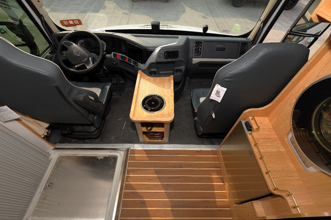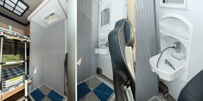 值得一提的是,这款乘龙T7房车淋浴室可装100L净水,并拥有30升大容量的电热水器,不用担心洗澡水量不够;使用智能水泵及重力加水口,水量大小随意调节;并采用冷热花洒,如果车内温度太高,冲个凉也很不错。