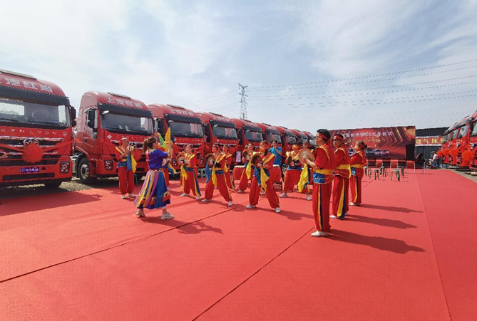 当日上午,交车活动在极具中国特色的锣鼓表演后正式拉开帷幕,上汽红岩领导、大客户代表、经销商等共同出席了本次活动。仪式上,一排排红岩杰狮LNG牵引车整齐排列,伴随着一阵热烈的掌声,上汽红岩晋陕蒙分公司总经理梁文瑞、中航国际汽车展销有限公司总经理尤建三分别登台致辞,并将象征着财富的金钥匙交给用户代表,共同见证这批红岩杰狮LNG牵引车开启低碳物流新征程。