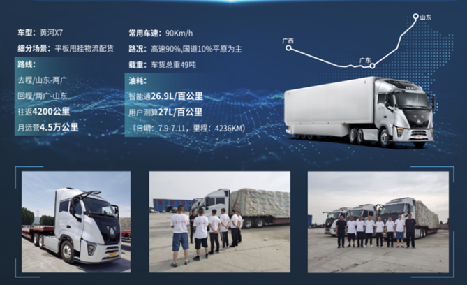 以黄河X7为例,在车货总重49吨的情况下,平板甩挂山东到广州,往返4200公里,月运营4.5万公里,客户实测平均油耗27L/百公里,客户评价:“油耗非常满意,动力充足,自动挡驾乘舒适”。