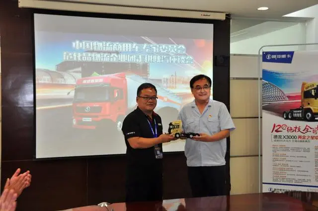 ▲ 陕西重型汽车有限公司副总经理周银朝和物流商用车网总编辑徐辉互赠礼物